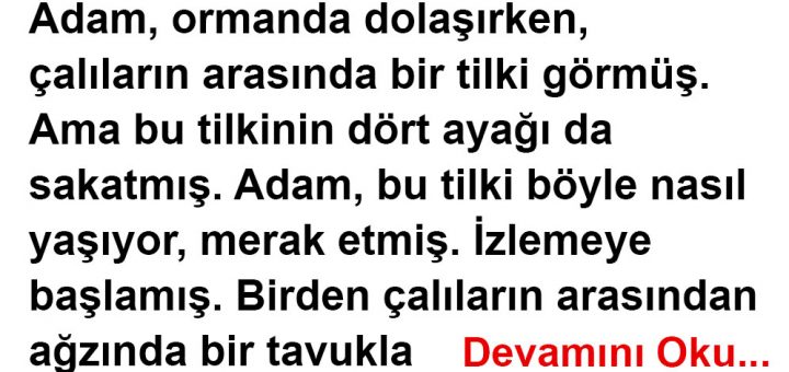Adam, ormanda dolaşırken, çalıların arasında bir tilki görmüş. Ama bu tilkinin dört ayağı da sakatmış. Adam, bu tilki böyle nasıl yaşıyor, merak etmiş. İzlemeye başlamış. Birden çalıların arasından ağzında bir tavukla bir aslan çıkmış...