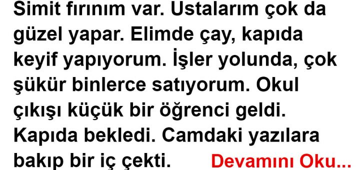 Simit fırınım var. Ustalarım çok da güzel yapar. Elimde çay, kapıda keyif yapıyorum. İşler yolunda, çok şükür binlerce satıyorum. Okul çıkışı küçük bir öğrenci geldi. Kapıda bekledi. Camdaki yazılara bakıp bir iç çekti. Sonra...