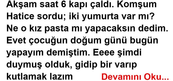 Akşam saat 6 kapı çaldı. Komşum Hatice sordu; iki yumurta var mı? Ne o kız pasta mı yapacaksın dedim. Evet çocuğun doğum günü bugün yapayım demiştim. Eeee şimdi duymuş olduk, gidip bir varıp kutlamak...