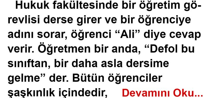 Hukuk fakültesinde bir öğretim görevlisi derse girer ve bir öğrenciye adını sorar, öğrenci “Ali” diye cevap verir. Öğretmen bir anda, “Defol bu sınıftan, bir daha asla dersime gelme” der. Bütün öğrenciler şaşkınlık içindedir, neye...