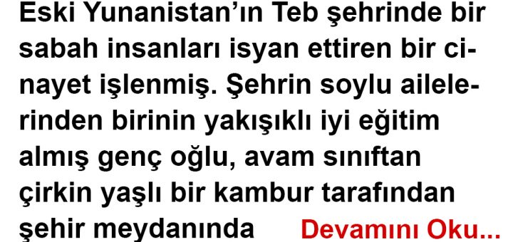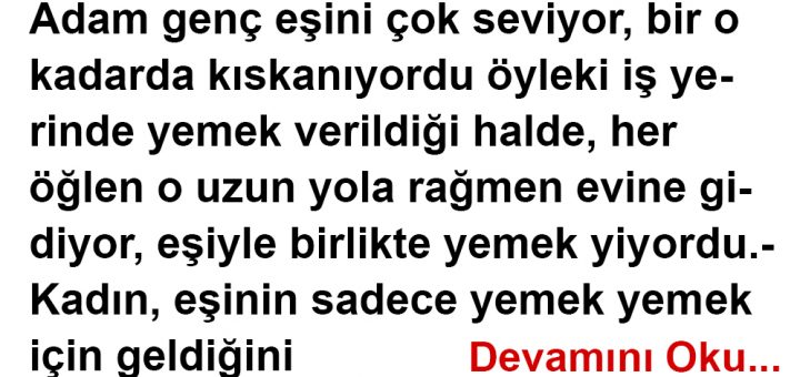 Adam genç eşini çok seviyor, bir o kadarda kıskanıyordu öyleki iş yerinde yemek verildiği halde, her öğlen o uzun yola rağmen evine gidiyor, eşiyle birlikte yemek yiyordu.Kadın, eşinin sadece yemek yemek için geldiğini düşünüyordu.Bilmediği...
