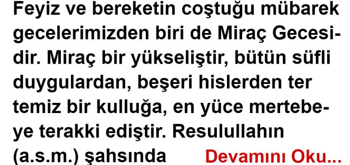 Feyiz ve bereketin coştuğu mübarek gecelerimizden biri de Miraç Gecesidir. Miraç bir yükseliştir, bütün süfli duygulardan, beşeri hislerden ter temiz bir kulluğa, en yüce mertebeye terakki ediştir. Resulullahın (a.s.m.) şahsında insanlığın önüne açılmış sınırsız...